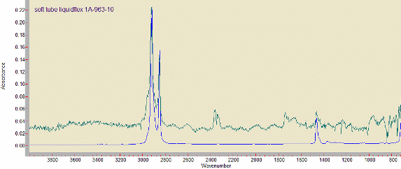 FTIR ATR spectra of the bulk polyethylene film (blue) and surface contamination (green). The surface is contaminated with low molecular fractions, oil and oxidized substances.