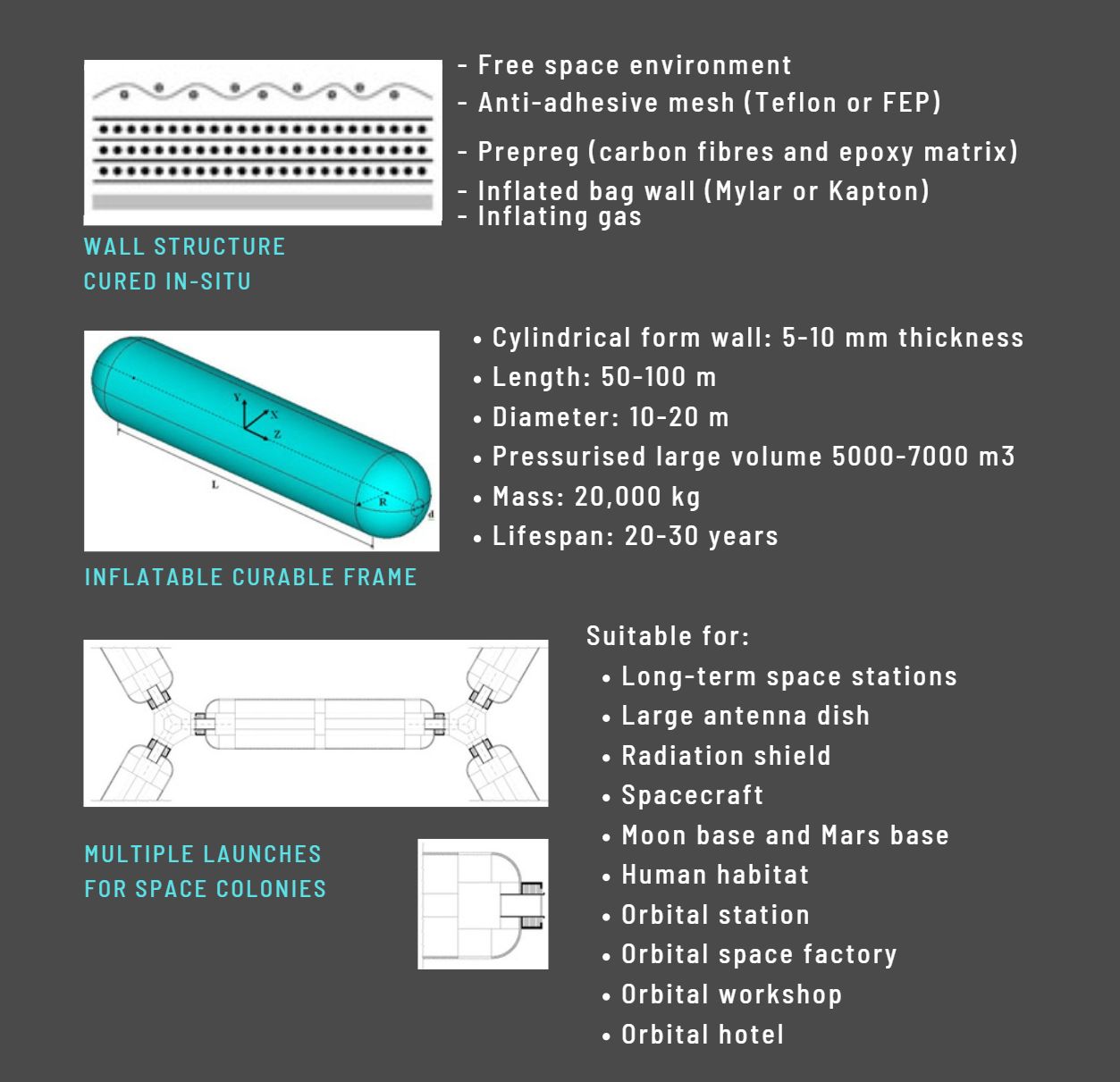 Ewingar Scientific have successfully developed and trialled a unique curing technology to build large-size space constructions, with each module measuring 10 times the length of current International Space Station modules. This state-of-the-art curing process of the fibre-filled composites enable it to be cured directly in free space (Earth orbit, Moon, Mars).