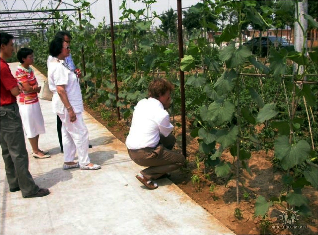 Prof. Galina Nechitailo and Prof. Alexey Kondyurin inspect a Chinese greenhouse where tomatoes previously exposed in space orbit are cultivated.